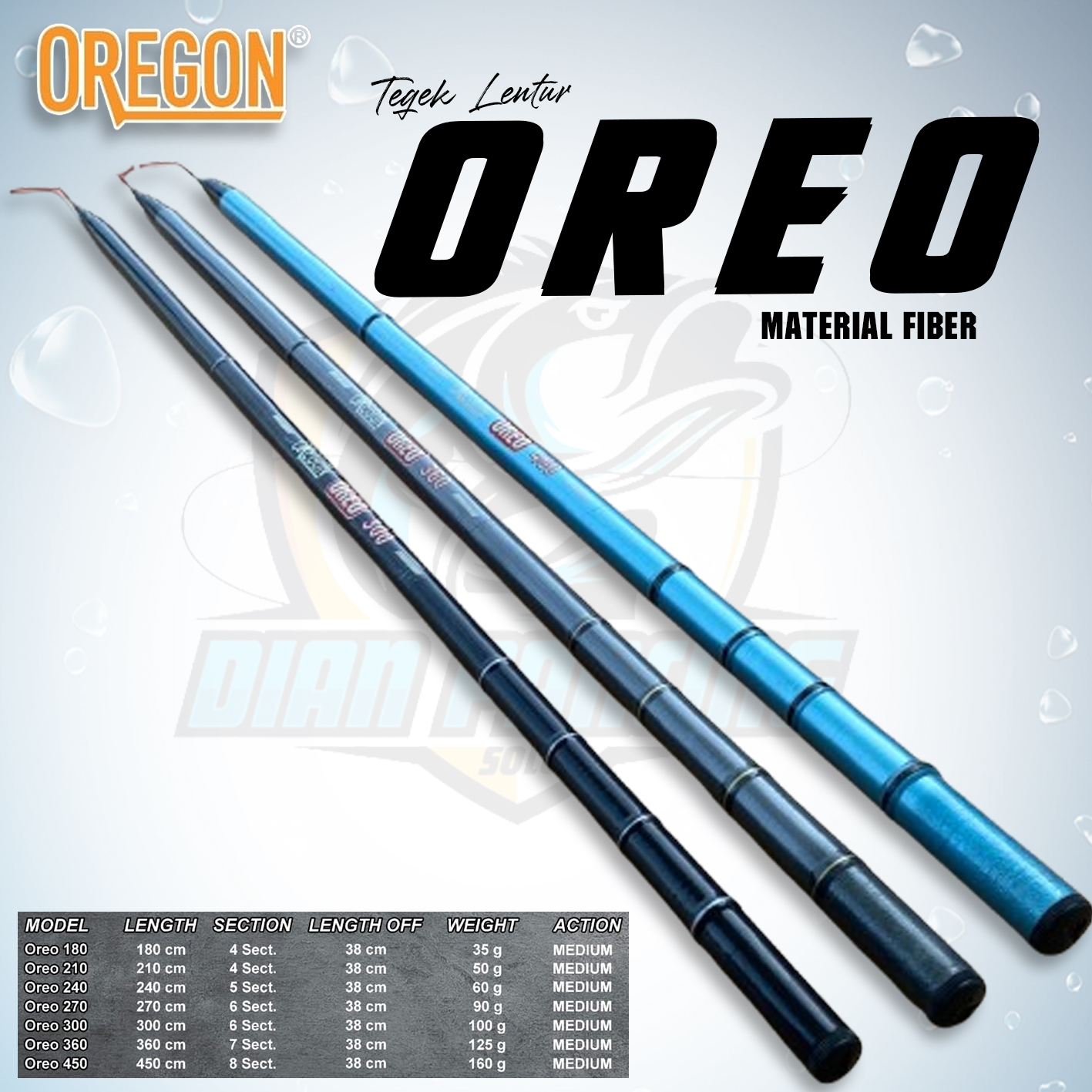 Joran Tegek Oregon Oreo action lentur bahan fiber ruas panjang 62cm ready panjang 180 sampai 450