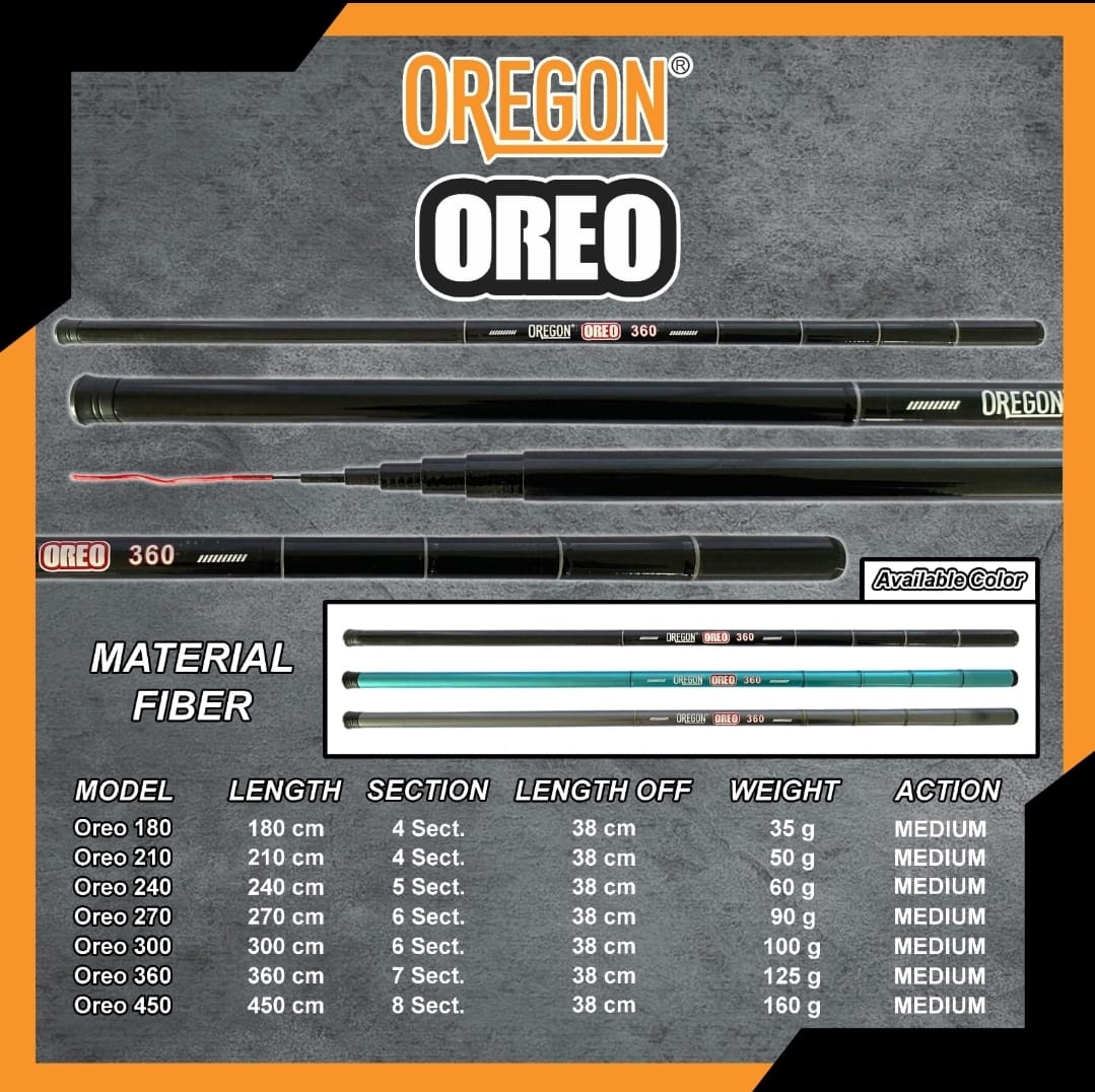 Joran Tegek Oregon Oreo tersedia dalam panjang 180 sampai 450.